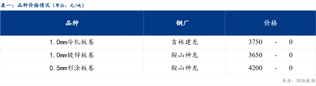 现东北主流市场冷轧镀锌价格持稳运行,沈阳市场冷轧板卷价格3750元/吨,镀锌板卷价格3650元/吨,彩涂板卷价格4250元/吨。具体来看,市场方面,今日热卷期货盘面偏弱运行,但市场现货报价持稳 ,今日交投氛围略显冷清,成交不及昨日,现货市场商家多有暗降出货,成交依靠刚需维持低位。操作方面,受东北地区季节限制,当前贸易商操作较为谨慎,回笼资金为主。综合来看,预计下一交易日东北市场冷轧及镀锌板卷价格或震荡运行为主。