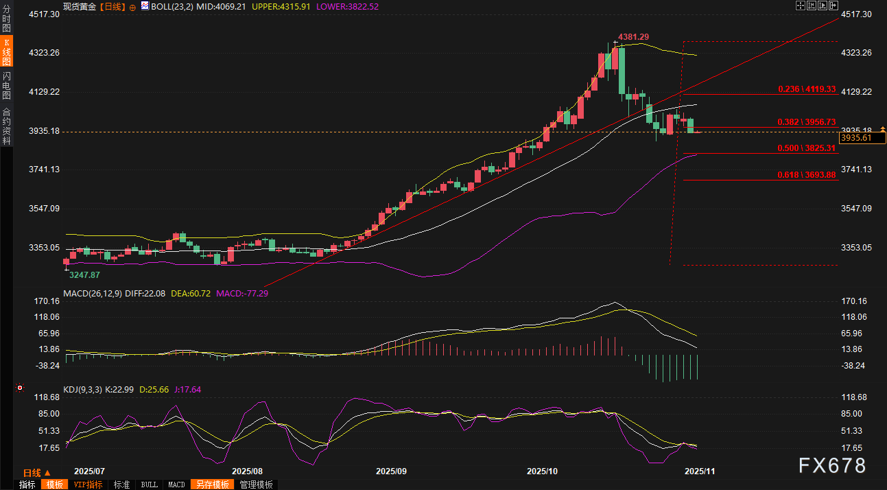 汇通财经APP讯——周二(11月4日)现货黄金震荡下跌1.7%,收报3931.78美元/盎司,12月美国期金同步下挫1.3%,结算价报3960.50美元。美联储官员内部分歧加大,市场对美联储12月降息预期降温,帮助美元指数升破100关口,刷新逾三个月高点,对金价打压明显。不过,美国股市泡沫隐忧与美国政府史上最长停摆仍给金价提供避险支撑。短期内,黄金空头略占上风,金价短线面临进一步回调风险,但若周三ADP民间就业数据爆冷,金价或迎来戏剧性反转。周三(11月5日)亚市早盘,现货黄金窄幅震荡,目前交投于3936.59美元/盎司。