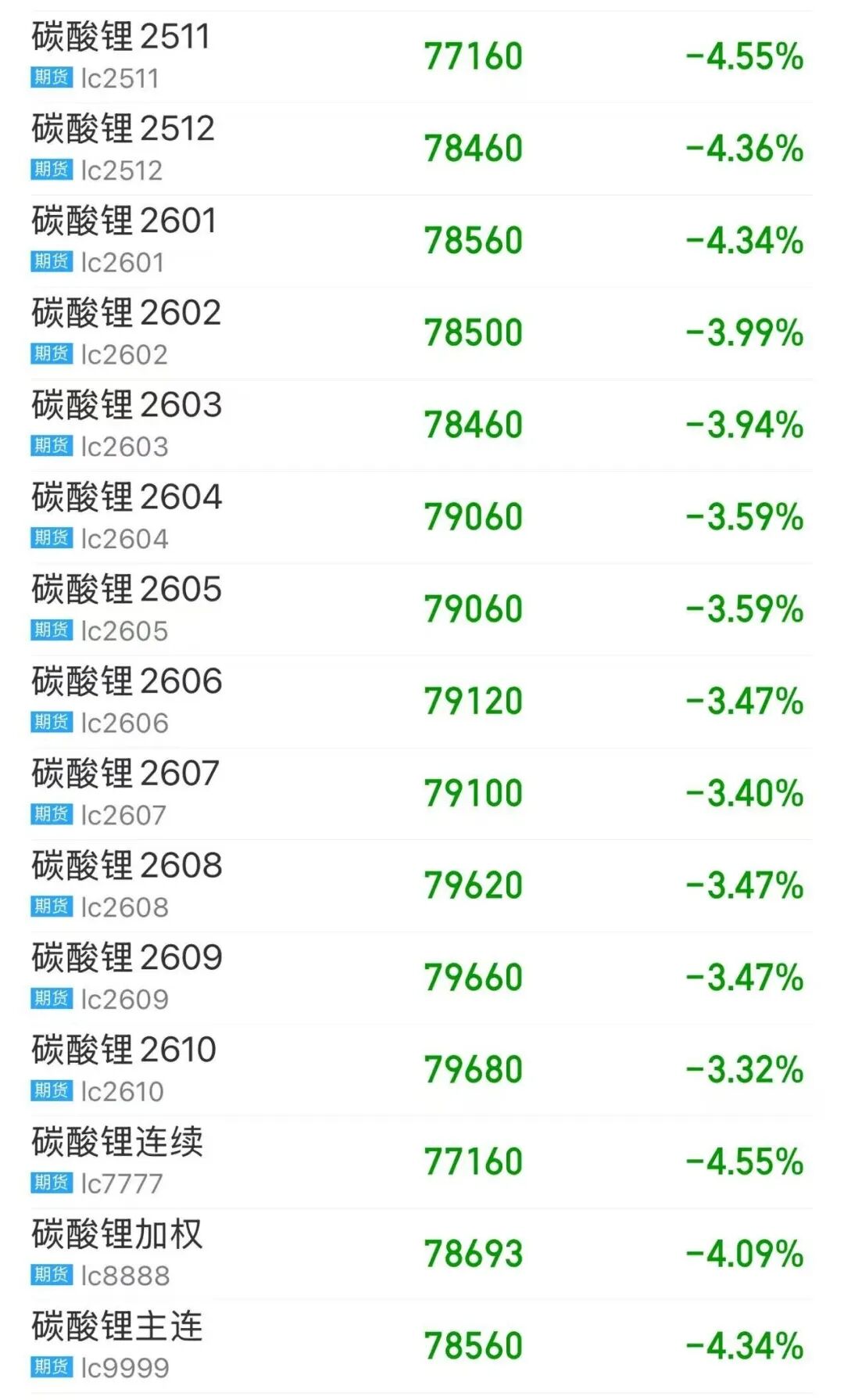 11月4日,碳酸锂期货价格大幅回落,主力2601合约收盘下跌4.34%,报78560元/吨。