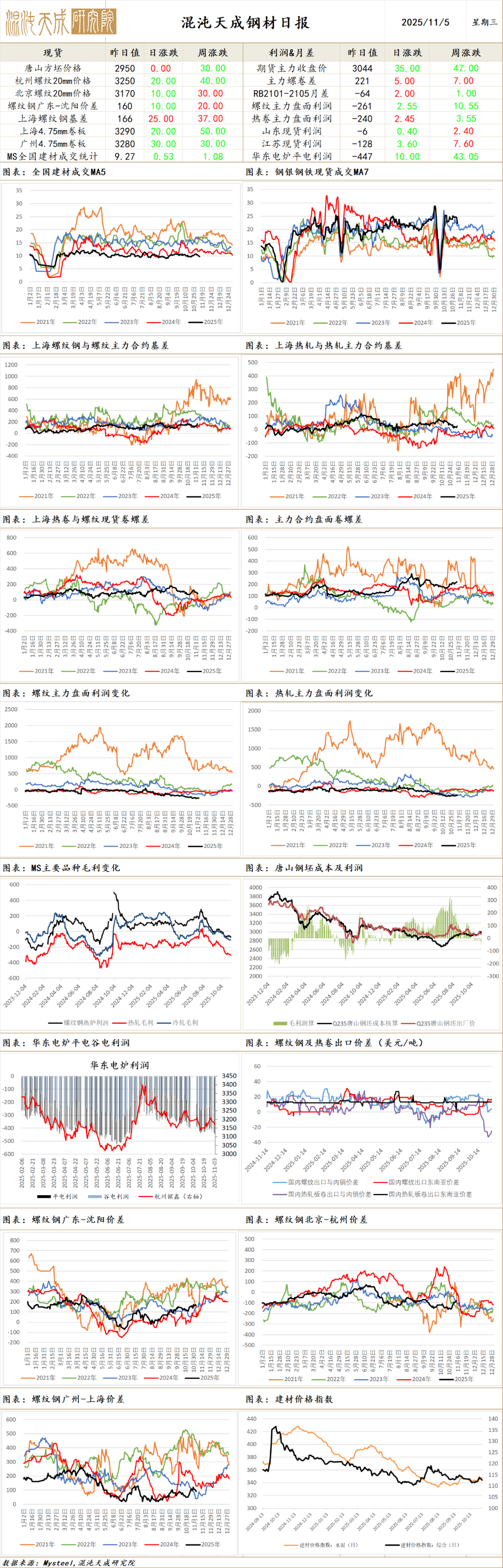 需求端,周一钢银城市钢材库存继续下降,各品种库存均有不同程度减量。上周机构数据显示钢材厂库、社库延续下降,且总库存降幅扩大,钢材表需有部分回升,建材、板材表需均有部分增长。另据百年建筑调研,上周全国水泥出库量282.65万吨,环比上升8%,基建水泥直供量环比上升5.7%;混凝土发运量为159.8万方,环比增加6.34%;样本建筑工地资金到位率59.7%,周环比上升0.08个百分点,显示近期建筑下游需求普遍有所回升。海外方面,当前美国政府停摆延续,但美联储10月如期降息25BP,随着中美领导会面宏观利好兑现,近期外盘商品偏震荡。国内方面,尽管10月制造业PMI表现不及预期,但近期国内货币及财政政策均有向好预期,国内宏观氛围依然偏暖。进出口方面,昨日国外主要地区钢价依然持稳,目前国内外冷热卷价差变动不大,国内钢材仍有部分出口空间。
