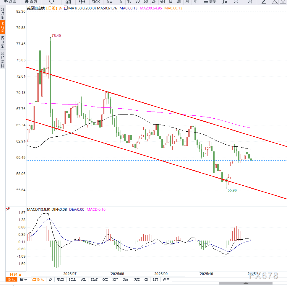 技术面同样显示空头仍占优势。WTI价格目前在60.20美元/桶附近徘徊,短期支撑位在59.65–60.00美元区间,若跌破这一水平,油价可能进一步下探至57.30美元甚至56美元附近。