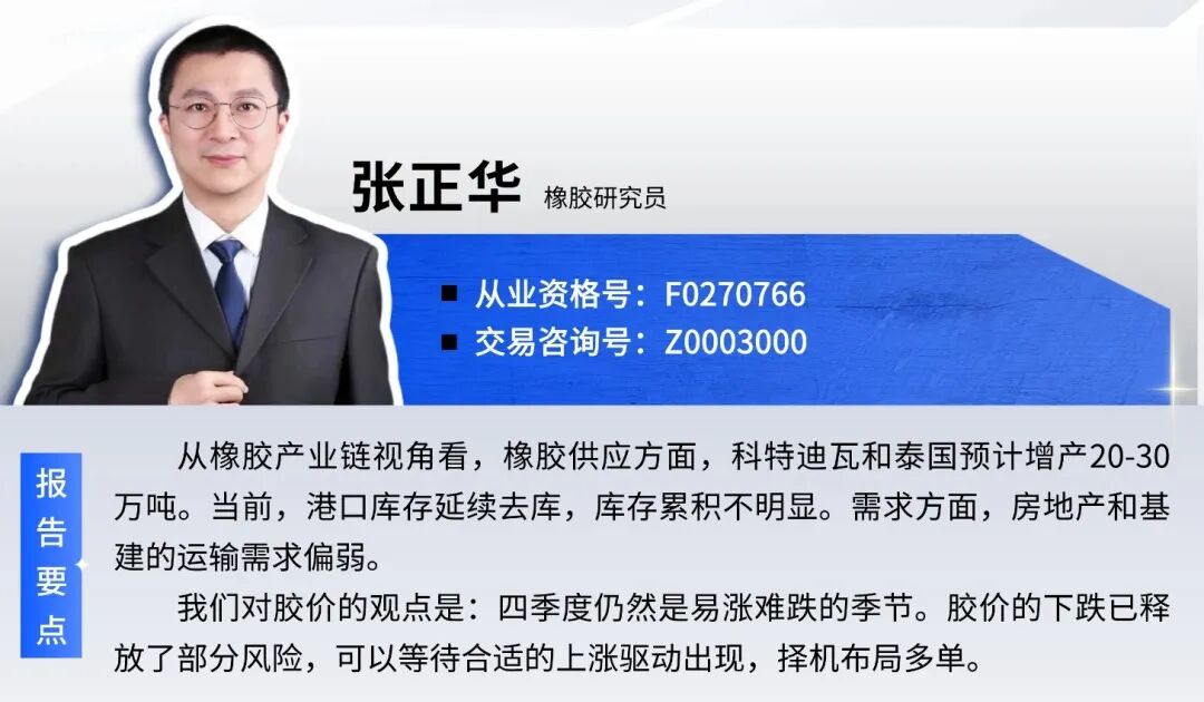 我们对胶价的观点是:四季度仍然是易涨难跌的季节。胶价的下跌已释放了部分风险,可以等待合适的上涨驱动出现,择机布局多单。