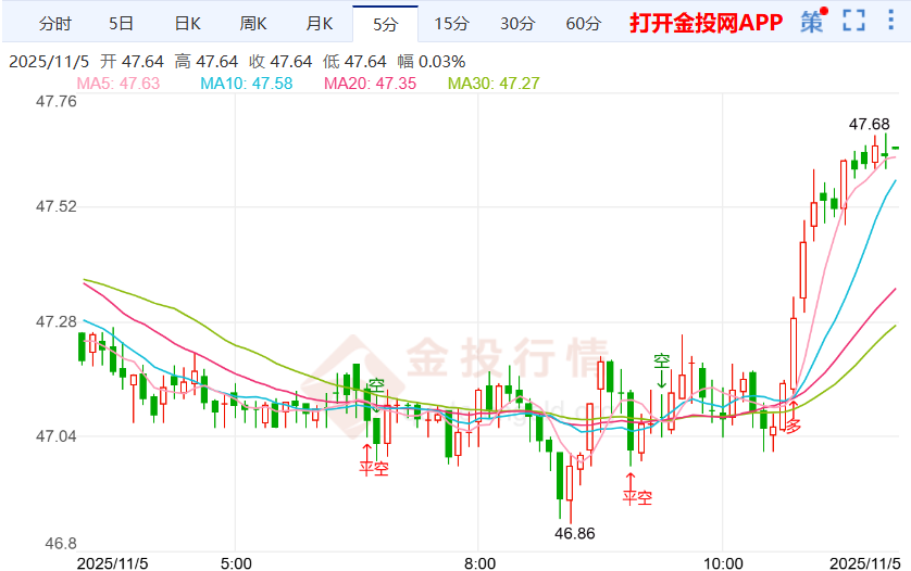 今日周三(11月5日)亚盘时段,国际白银目前交投于47.52一线上方,今日开盘于47.17美元/盎司,截至发稿,国际白银暂报47.64美元/盎司,上涨1.08%,最高触及47.68美元/盎司,最低下探46.86美元/盎司,目前来看,国际白银盘内短线偏向看涨走势。