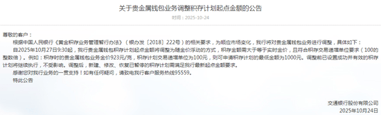 比如,10月24日,交通银行发布公告,自2025年10月27日9:30起,该行贵金属钱包积存计划起点金额将调整为随金价浮动的方式,积存金额需大于等于实时金价,且符合积存交易递增单位要求(100的整数倍)。例如:积存时的贵金属钱包业务金价923元/克,积存计划交易递增单位为100元,则可申请积存计划的最低金额为1000元。调整前已设置成功并有效的积存计划将继续执行,不受影响。调整后,新建、修改、恢复已暂停的积存计划需满足我行最新起点金额要求。