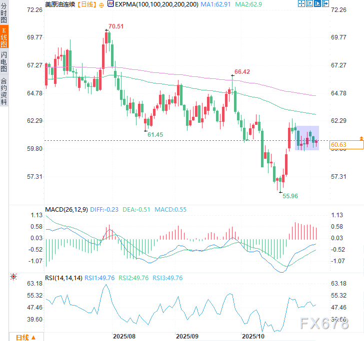 下行方向,59.64美元震荡区间底部与59.00美元构成初步支撑带,若有效跌破该支撑带,下一支撑位看向10月10日低点58.22。