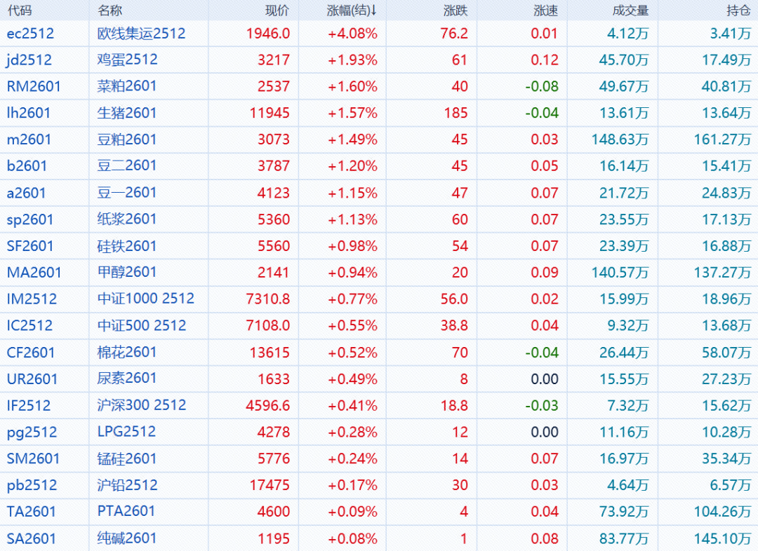 沪深300股指期货(IF)主力合约涨0.41%,上证50股指期货(IH)主力合约跌0.01%,中证500股指期货(IC)主力合约涨0.55%,中证1000股指期货(IM)主力合约涨0.77%。