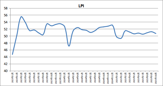 中国物流与采购联合会发布的2025年10月份中国物流业景气指数为50.7%,环比回落0.5个百分点。在前期需求充分释放基础上,10月份物流业景气指数有所回落,但仍保持扩张态势,其中业务总量指数、新订单指数、资金周转率指数、物流服务价格指数、固定资产投资完成额指数、从业人员指数和业务活动预期指数处在景气区间。