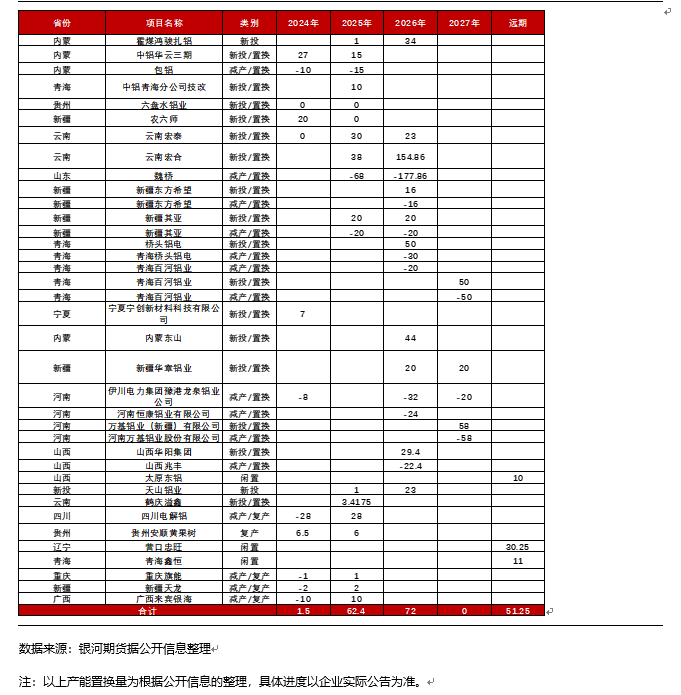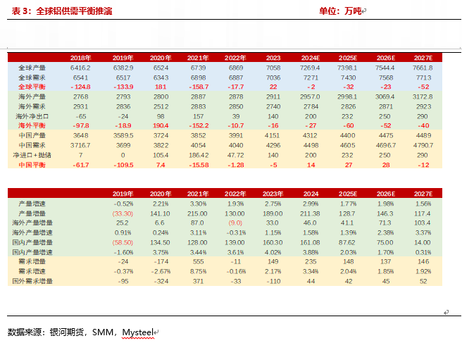 2018年初工业和信息化部发布《关于电解铝企业通过兼并重组等方式实施产能置换 有关事项的通知》(工信部原〔2018〕12号)以来,电解铝产能的净增以产能置换进行。近年来国内电解铝产能开工率持续提高,截至2025年10月,中国电解铝建成产能4523.2万吨,运行产能4443.40 万吨,开工率达98.24%。而2026年,预计我国电解铝产能净增为72万吨,其中包括内蒙霍煤鸿骏净增的35万吨、豫港龙泉铝业公司计划置换但目前未开满的6万吨、山西华阳铝业置换山西阳泉铝业已拆除的6.9万吨、天山铝业20 万吨电解铝富余指标20万吨等。其余产能变动均是置换为主,部分企业为降低电耗等指标、积极响应政策引导,更换电解槽、进行技术改造,向国家要求的目标电耗指标靠拢。而2027年,企业目前公示的产能变动均是等量置换,并没有产能净增。我们核算2026年及2027年我国电解铝产量分别为4475万吨及4489万吨,产量增量为75万吨及14万吨,增速为1.7%及0.31%。由于我国电解铝产量占全球的近60%,2027年我国电解铝产量增速的骤降带动全球电解铝增速显著下滑。而据不完全统计,目前闲置的电解铝产能亦仅剩50余万吨。