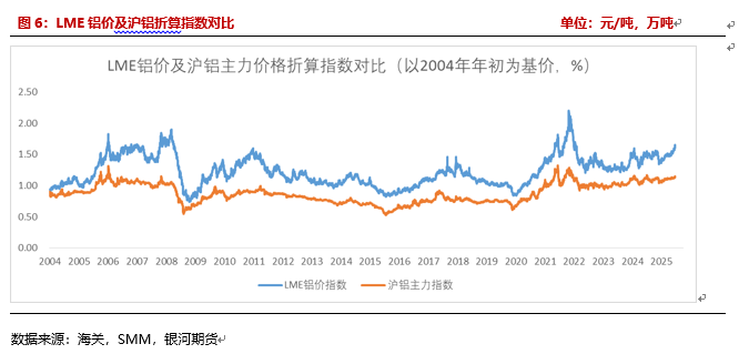 我们对比2004年以来伦铝和沪铝的价格走势不难发现,沪铝在2006年及2021年两次触及24000元/吨附近时,内外价差均有所走扩,沪被动跟涨LME铝价为主。