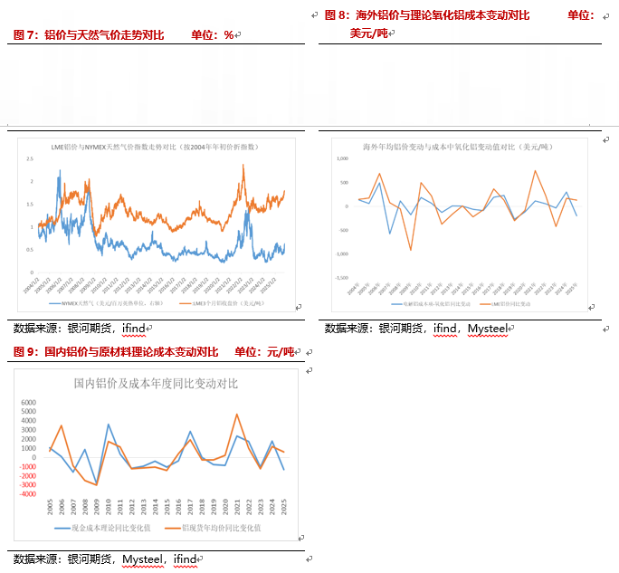 而LME铝价的上涨均伴随着成本的显著上涨。从电解铝的冶炼成本来看,氧化铝及能源成本占总成本的70%左右。考虑历史数据连续性问题,我们使用海外天然气价格来作为海外能源价格波动情况的参考,发现在2006年、2008年及2021-2022年伦铝价格的冲高均伴随着能源成本的上涨,而从氧化铝价格来看,2006年LME年均价同比上涨的694美元中,有492美元是氧化铝价格上涨贡献的,占铝价上涨值的70%。2021年沪铝年均价同比上涨的4709元中,有2323元是氧化铝、煤炭及阳极等主要原料成本的上涨贡献的(占铝价上涨值的49%)。
