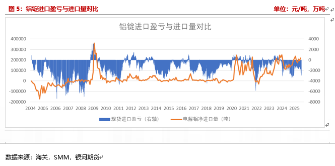 因为海外地缘因素,铝锭存在不考虑内外价差的进口量,所以近两年国内铝需求的缺口被进口量覆盖、但内外价差却仍是亏损表现。而2026年除了这一部分铝锭进口量预计维持之外,还会有一部分印尼新投铝锭回流国内,预计铝锭维持理论进口亏损,而这一情况或在2027年因国内供应增速骤降而得到改变。