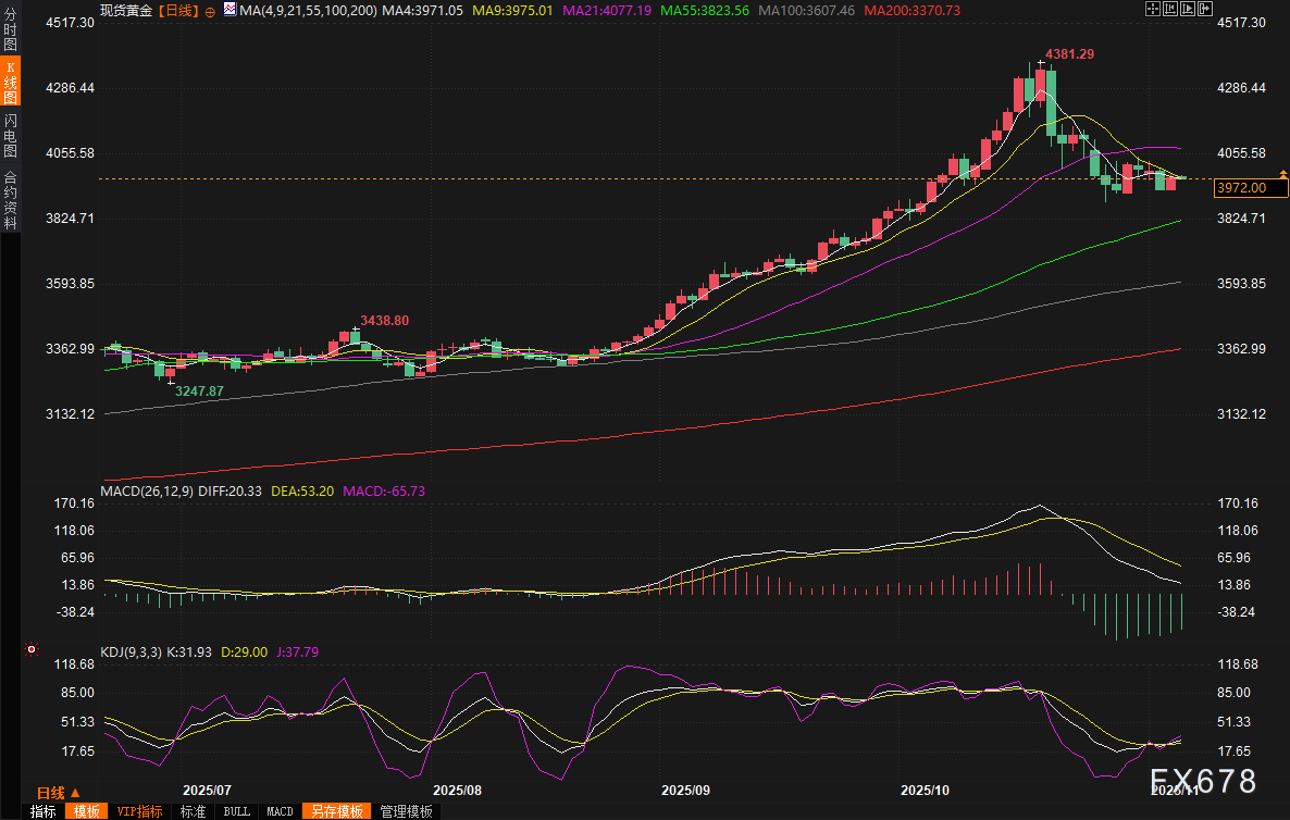 汇通财经APP讯——周四(11月6日)亚市早盘,现货黄金一度跌破3970美元,最低触及3966美元,目前交投于3972美元/盎司附近,跌幅约0.15%,不过仍守住隔夜大部分涨幅。周三金价上涨1.2%,最高摸到3990.24美元,收盘3978.95美元,距离4000美元整数关仅一步之遥!因逢低买盘和避险买盘支撑金价,不过ADP就业数据强于市场预期,ISM非制造业PMI数据也表现强劲,市场对美联储12月降息预期降温,美元指数刷新近五个月高点,美债收益率大涨至近一个月高点,令多头有所顾忌。