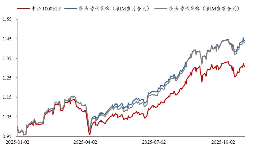 以2025年1月2日至10月31日做复盘分析,假定基础组为持有南方中证1000ETF基金50万份,对应初始市值115.9万元,对比组为期货端用30%的资金作为期货保证金,剩余70%的资金做现金管理,无风险收益率为2%,股指期货在最后一个交易日进行移仓换月,滚IM当月合约和滚IM当季合约的初始权益分别为115.9万元及114.0万元。今年截至10月底,中证1000ETF累计收益率为31%,滚IM当月合约的多头替代策略累计收益率为43%,滚IM当季合约的多头替代策略累计收益率为42%,即IM多头替代策略实现了约11%-12%的“增厚收益”。