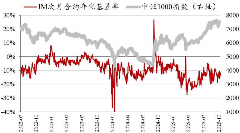 回顾IM基差走势,以IM次月合约为例,一是基差极值通常伴随股指极端行情出现,例如2024年2月初股指暴跌,导致负基差快速走阔,年化基差率罕见出现-30%至-40%后快速收敛,又如2024年9月底股指暴涨行情下,负基差快速收敛至罕见的+20%以上水平,但这种极值情况持续时间极短。二是今年以来呈震荡市-基差走阔的特征。基差在2月至5月贴水逐步加深至超-20%水平,对应上市以来历史分位数低于1%,彼时市场经历AI叙事发酵支撑股指回弹去年底高位、风险情绪支撑股指修复“对等关税”回撤等,即在“填坑式”震荡行情中,基差走阔至年化-20%以下的历史较极值情况。这背后体现了期货多空需求的不均衡性,一方面,挂钩股指的结构化产品存续规模维持低位,市场情绪在指数完成填坑式修复后偏谨慎,多头资金相对缺失,另一方面中性策略空头套保需求维持相对稳定,多空头寸失衡使得深贴水出现。后随着股指蓄势突破上涨,基差有所收敛。