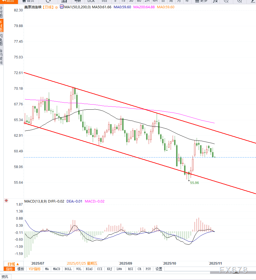 RSI 指标目前运行在弱势区间,尚未出现明显背离信号,说明多头尚未形成有效反击。从技术面结构可以看出,若油价继续跌破59美元关键支撑,下方可能打开至58美元甚至56.8美元的空间;