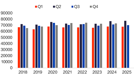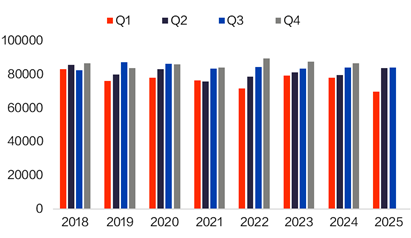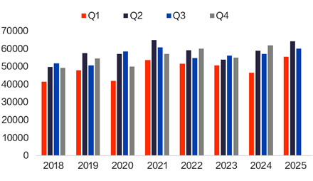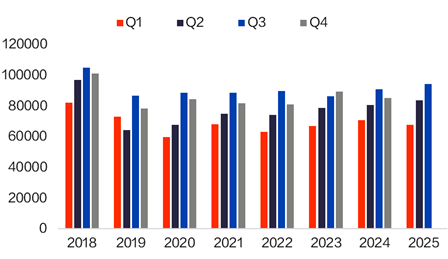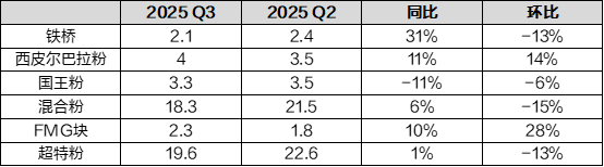 淡水河谷2025年三季度铁矿石粉矿产量为9440.3万吨,同比增加3.8%,环比增加12.9%,球团矿产量为799.7万吨,同比下降22.8%,环比增加1.9%。铁矿石销量达8599.7万吨,同比增加5.1%,环比增加11.2%。淡水河谷维持2025年的产量指导目标为3.25-3.35亿吨不变,预计最终落在指导区间上半部分。
