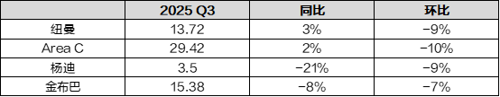分品种来看,同比方面,三季度杨迪和金布巴矿区的产量下滑,C矿区和纽曼矿区的产量小幅增长;环比方面,各矿区的产量均出现下滑。