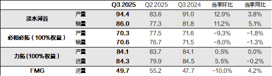 2025年三季度铁矿石粉矿产量为9440.3万吨,同比增加3.8%,环比增加12.9%,铁矿石销量达8599.7万吨,同比增加5.1%,环比增加11.2%。淡水河谷三季度表现良好,多个项目正在产能爬坡,产量和销量同步提升。淡水河谷维持年度指导目标不变,我们认为其具备较好完成指导目标的能力。