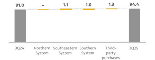 三季度南部系统的产量同比增长100万吨,得益于Vargem Grande综合体表现的改善,这主要由于VGR1项目的产能爬坡和维护停机时间的减少。