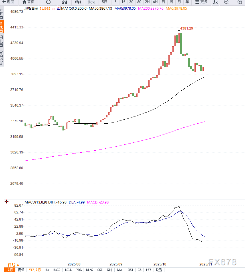 从黄金日线结构来看,金价近期在4000美元整数关口附近受阻,连续多日回调,目前下探至3950–3970美元区间支撑带。K线运行在20日均线下方,且MACD动能柱持续减弱,显示短线趋势偏弱。