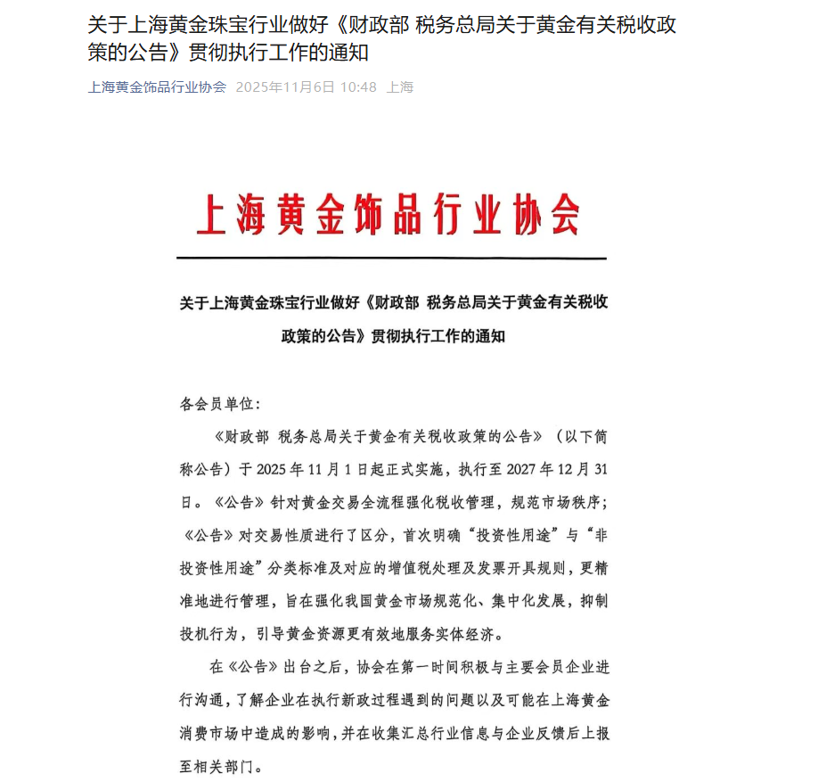 11月6日,上海黄金饰品行业协会发布关于上海黄金珠宝行业做好《财政部 税务总局关于黄金有关税收政策的公告》贯彻执行工作的通知,要求各会员单位应当准确把握政策要求,规范税收征管操作,做好企业内部的合规化管理,强化保障措施做好税收新政的落地实施工作,与此同时,进一步提升产品品质、服务水平、品牌影响力,确保市场平稳发展。