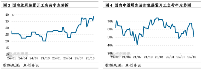 从供需面来看,10月西北地区供应增多而需求下降,对市场指引偏空。供应方面,10月西北地区兰炭装置开工负荷率均值为37.03%,环比提升3.25个百分点,部分前期检修兰炭装置复产,中温煤焦油产出量亦同步增多;需求方面,下游加氢装置开工下降,刚需整体转弱。10月中国中温/中低温煤焦油加氢装置开工负荷率均值为61.28%,环比下降2.34个百分点,月内山东、新疆地区煤焦油加氢装置检修数量增加,下游刚需采购量同步减少;从终端来看,受原油下行、消费淡季、降雨天气等因素影响,10月终端汽柴油消费力度偏弱,烧火油交投则持续低迷,对中上游产品存在负面反馈。
