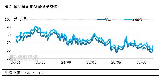 从成本面指引来看,10月国际油价整体呈现先跌后涨再度回落行情,美原油均价59.98美元/桶,较上月跌5.59%,同比去年跌16.18%;布伦特原油均价63.8美元/桶,较上月跌5.59%,同比去年跌15.36%,这对国内中温煤焦油产业链相关产品存在下行指引。月初油价不断下跌,主要利空来自美国针对中国的贸易威胁,可能提高关税到100%,市场担忧情绪为主,风险偏好降温。随后月末油价先涨后跌,上涨利好来自美国对欧洲某国的石油公司实施限制措施,市场担忧供应中断,且印度已经从欧洲某国大幅的降低石油采购,且中美和谈顺利,宏观转暖;随后油价高位回落,利空主要是沙特可能继续增产,延续增产抢占市场份额的政策。