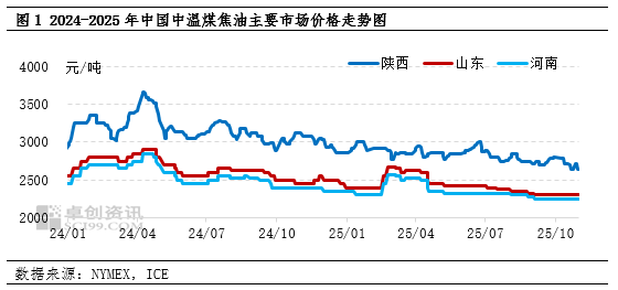 10月国内中温煤焦油市场延续偏弱震荡态势,均价环比继续下跌。截止到10月底收盘,陕西市场月度均价收于2704元/吨,环比下跌1.46%。本月国际油价下跌显著利空国内油市,终端及下游加氢市场需求减弱,买方对原料端的压价情绪不断提升,主产区兰炭工厂煤焦油价格自月初连续承压下跌。不过,同期煤价上行也限制了跌幅进一步扩大,随着下旬原油价格宽幅反弹,市场交易氛围也随之回暖,临近月末煤焦油价格止跌反弹。