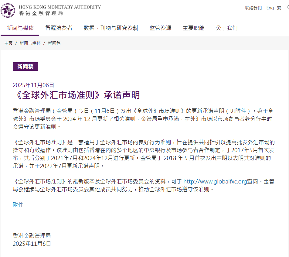11月6日,香港金融管理局(金管局)发出《全球外汇市场准则》的更新承诺声明。鉴于全球外汇市场委员会于2024年12月更新了相关准则,金管局重申承诺,在外汇市场以市场参与者身分行事时会遵守该更新准则。