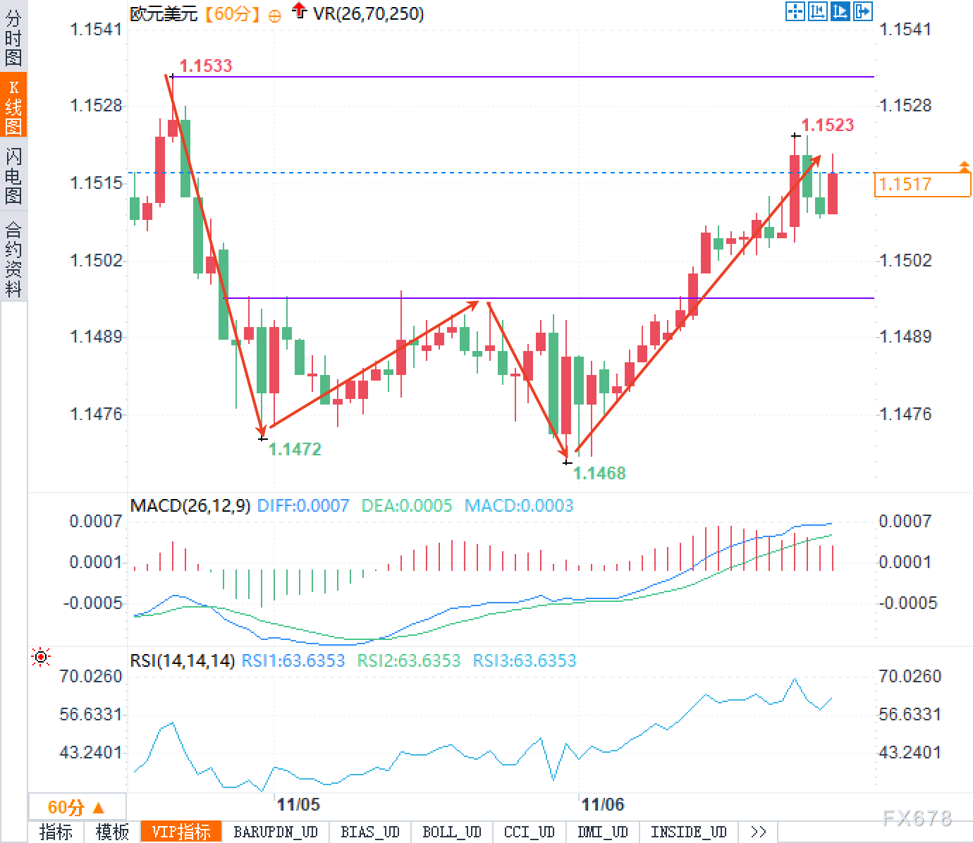 结构与形态:1.1468—1.1523构成最近一轮“V型反转+回测突破”,紫色水平线附近的颈线一度压制,突破后转化为阻力转支撑的“支撑位”。若回踩不跌破,该“W型反转”有望延续。