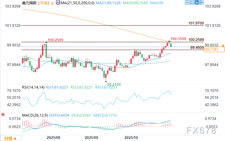 汇通财经APP讯——周四(11月6日)美盘时段,劳动力市场疲软拖累美元和收益率,美元指数下跌,在本周早些时候尝试突破100.360失败后,其回调幅度扩大至200日均线以下。该指数下跌0.3%,至99.753。在裁员公告激增和美国国债收益率普遍下降后,风险情绪变得谨慎。