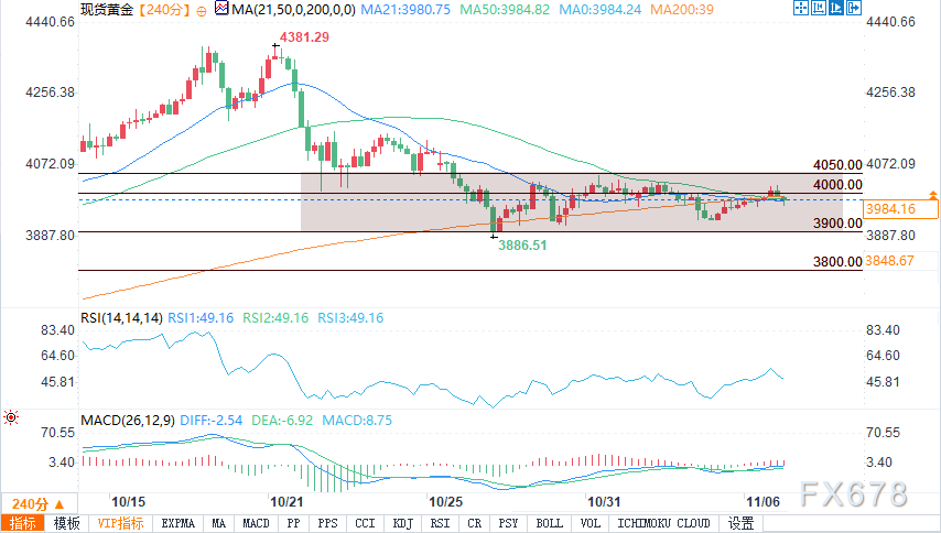 汇通财经APP讯——周四(11月6日)美盘时段,现货黄金在美元走弱的背景下短暂收复4000美元心理关口后小幅走低。金价盘中交投于3985美元左右,较日内高点4019美元有所回落,涨势陷入停滞。