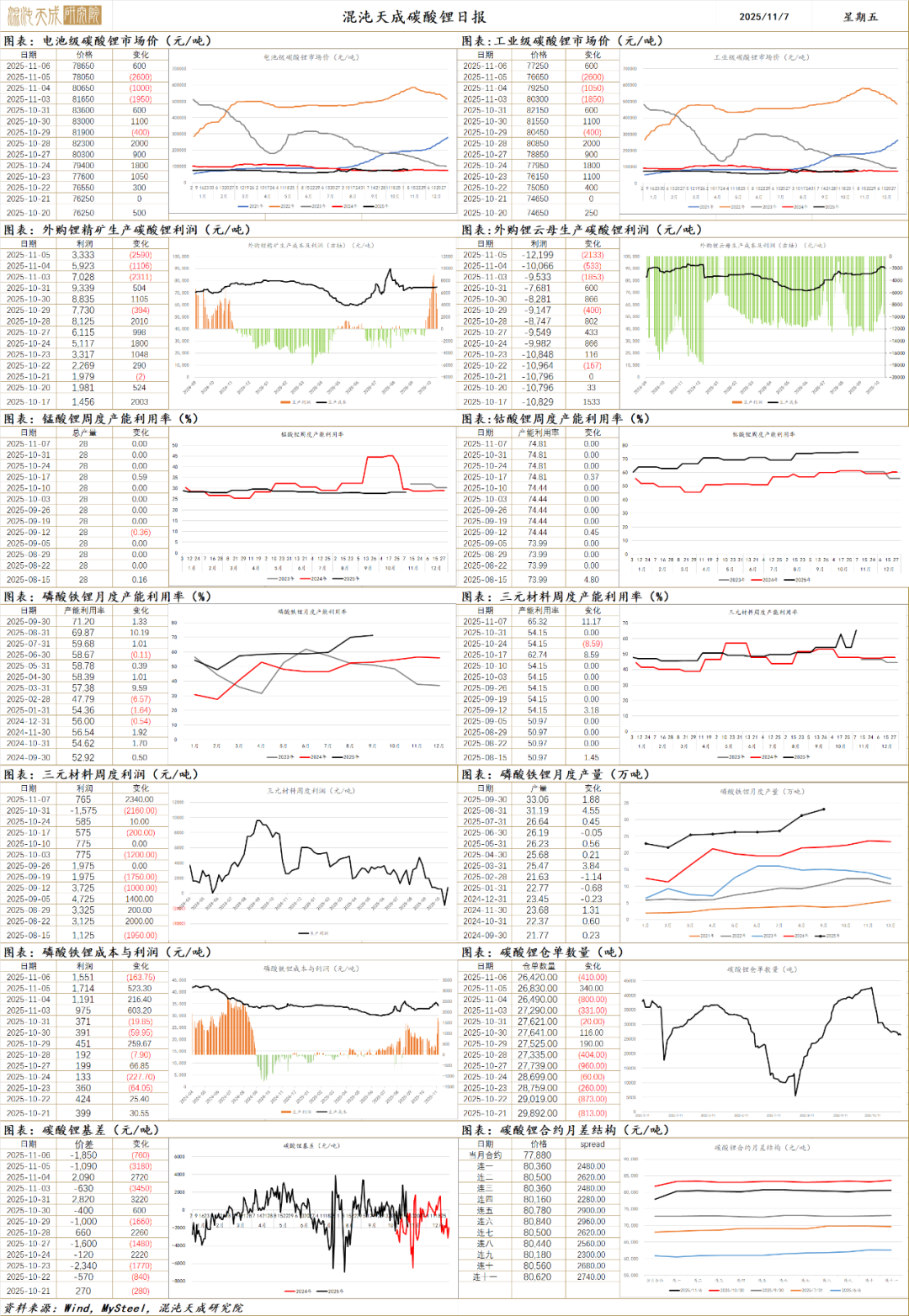 3、【需求提振智利对中国出口碳酸锂规模显著回升】智利海关公布的数据显示,智利10月锂出口量为27562吨,其中碳酸锂出口量为24769吨。当月对中国出口碳酸锂16210吨,同比下降4%,环比增加46%。下游处于传统需求旺季,叠加储能需求超预期,智利对中国出口碳酸锂显著回升,刷新2025年4月以来高位。