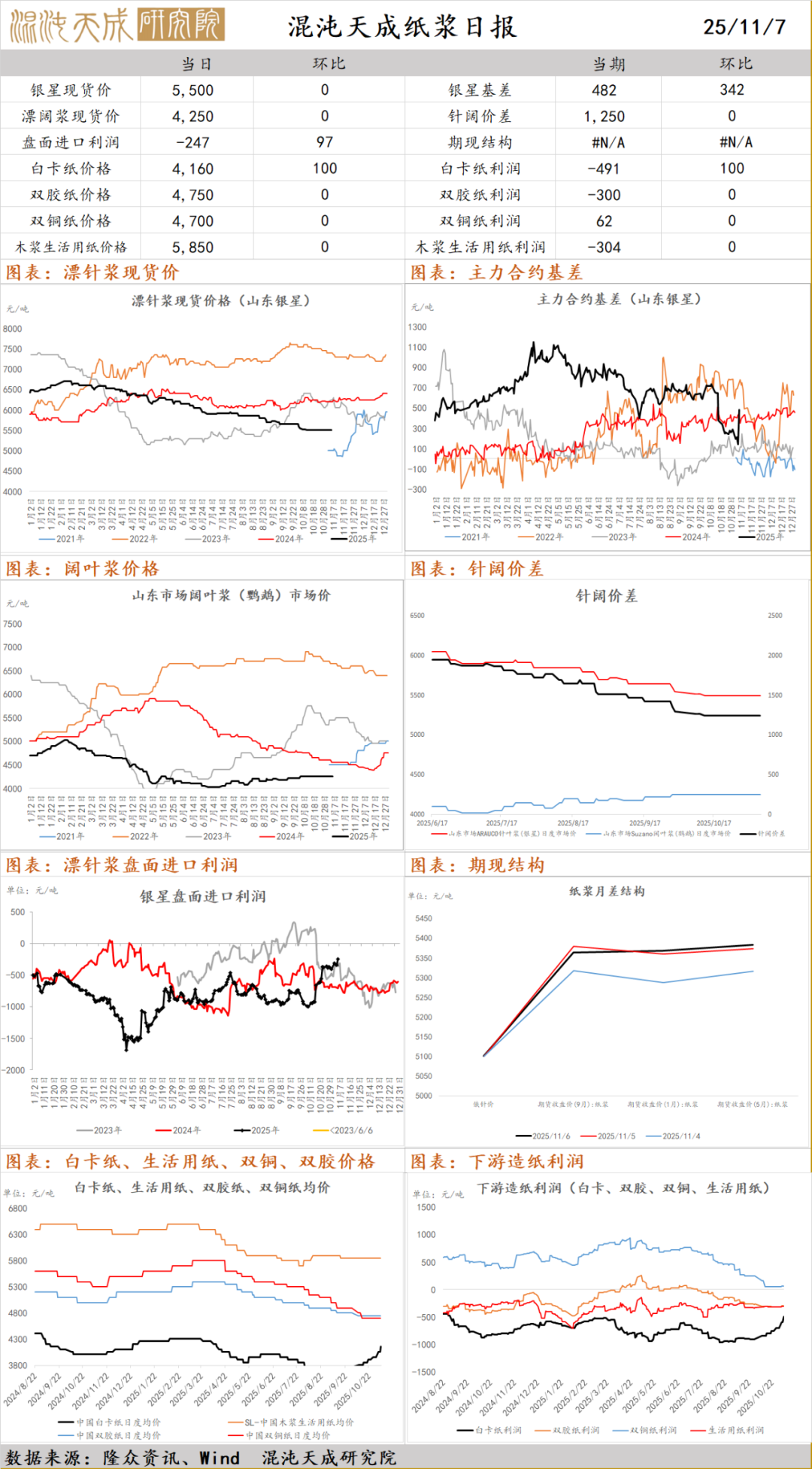 纸浆:昨日国内针叶浆现货稳定,银星5500元/吨(0),俄针5100元/吨(0);阔叶浆现货稳定,金鱼4250元/吨(0);针阔叶浆价差1250元/吨(0),现货市场交投一般;白卡纸市场行情延续稳中上扬局面,市场交投有好转迹象,业者保持涨价态度;生活用纸市场价格区间整理为主,市场交投活跃度变化不大;文化用纸市场盘整运行,成交未见明显起色;本周国内纸浆主流港口样本库存量为200.8万吨,较上期去库5.3万吨,环比下降2.6%;本周下游开工,白卡纸环比-1.1%,双胶纸环比+0.9%,铜版纸环比-0.8%,生活纸环比-0.1%;受宏观利好及海外浆厂减产预期影响,盘面反弹,随后偏强运行;行业基本面没有明显改观,需求改善不显著及旺季不旺,下方有成本支撑,关注纸厂补库和政策影响持续性,远期合约不宜过度看空。