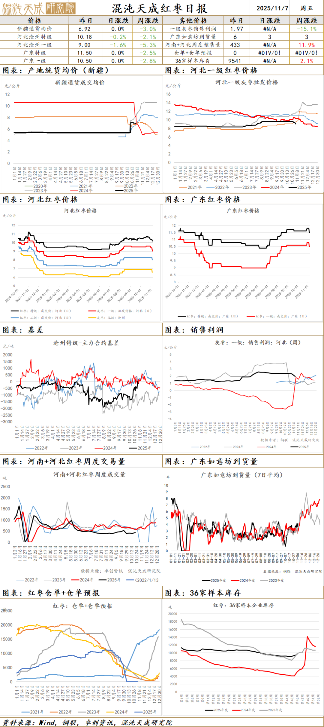 河北崔尔庄市场停车区到货9车,结合价格陈货比新货更受市场青睐;广东如意坊市场到货6车,市场货源供应充足,客商拿货积极性一般,新货价格高于陈货市场接受度较低;盘面大跌之后横盘震荡,前期锁定的陈枣逐步流出,按照盘面-600至-1000元/吨的价格出售,陈枣现货抛售压力增大,收购价格预计会进一步回落;今年整体产量维持55万吨±5万吨的观点,整体供需过剩比较明确,目前盘面已经大幅下跌,维持反弹逢高空的策略。