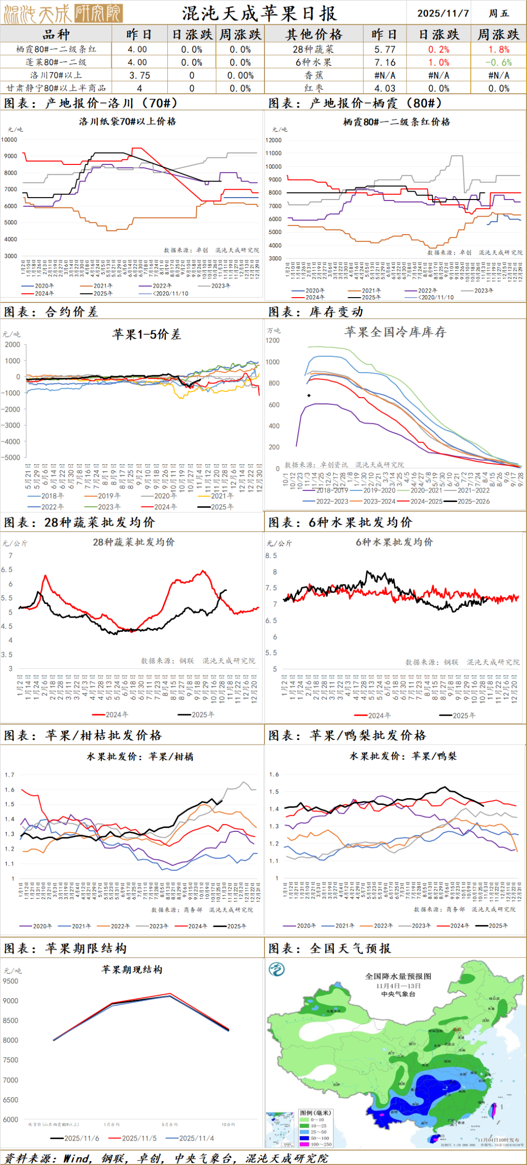 苹果:Mysteel数据:截至2025年11月5日,全国主产区苹果冷库库存量为698.42万吨,低于去年同期(2024年11月6日813.44万吨)115.02万吨,跌幅14.14%,由于目前部分主产区入库工作还在进行中,本期库存仅反应当前全国入库进度;卓创咨询:截止到2025年11月6日全国冷库库存比例约为51.68%,库存量为682.74万吨;山东产区一二级半货源价格稍有下调,统货当前主流成交2.8-3.0元/斤,统货成交价格比较难到3.0元/斤以上,大型贸易商扎点采购结束,交易集中在收购市场,收购市场上货量稍有减少,栖霞地区80#以上一二级半货源3.0-3.3元/斤,一二级货源3.5-4.0元/斤,收购难度比较大,上量较少;陕西产区主流价格稳定,库外收储已经进入尾声,库外多交易低质量货源,多以直接发市场为主,冷库继续入库,主要外来货源入库为主,洛川产区近期70#起步主流订货价格3.5-4.0元/斤,好货4.0-4.5元/斤,以质论价;目前处于供应端交易进入尾声,第三方咨询机构公布第一期入库量均低于700万吨,由于今年下树入库有所推迟,产区仍在陆续入库中,市场分歧较大,短期震荡,近期主要关注入库情况。