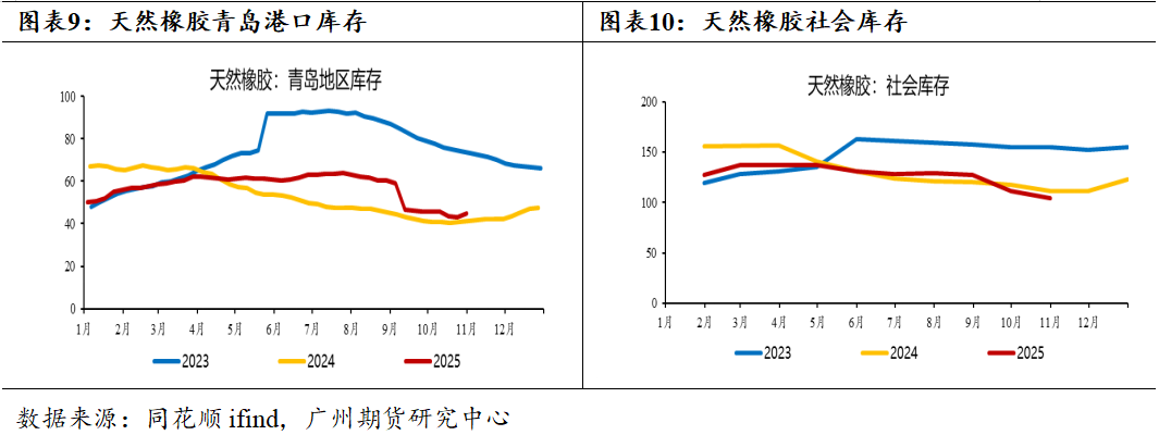总体来看,目前全球天然橡胶产区处于割胶期,东南亚主产区的天气基本正常。云南产区加工厂采购需求稳定,预计部分有落价预期,各片区采购价格存差异;海南产区强降水天气持续,部分地区甚至出现水涝灾害,岛内割胶作业难以开展,新鲜胶水供应明显紧张,当地橡胶加工厂实际原料可收购量较为有限,需求方面,目前正值11月初,市场交投零星,更多消化前期库存,备货谨慎。随着天气转冷,北方全钢胎替换市场需求将进一步转弱,另外半钢胎的雪地胎产品逐步到位,市场拿货积极性将放缓,多以前期订单补齐为主鲜有收胶价格听闻。青岛一般贸易累库超预期,也是近期胶价显著回调的主要原因。