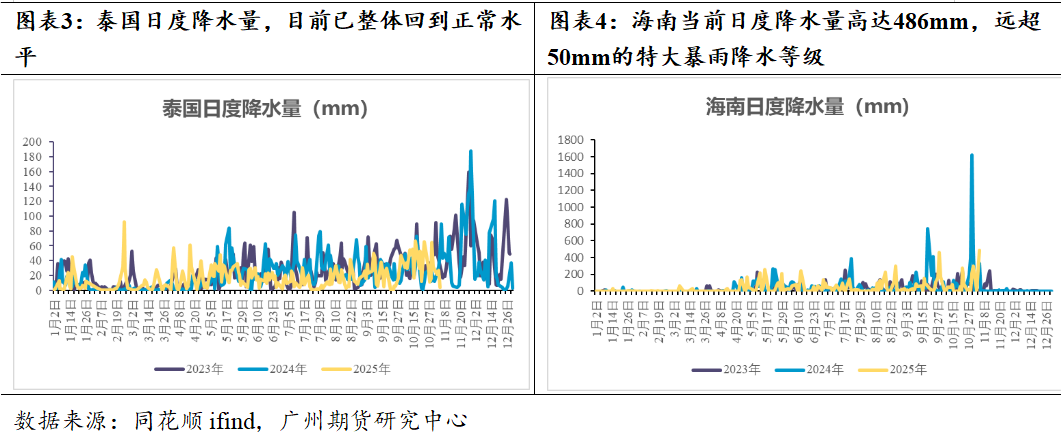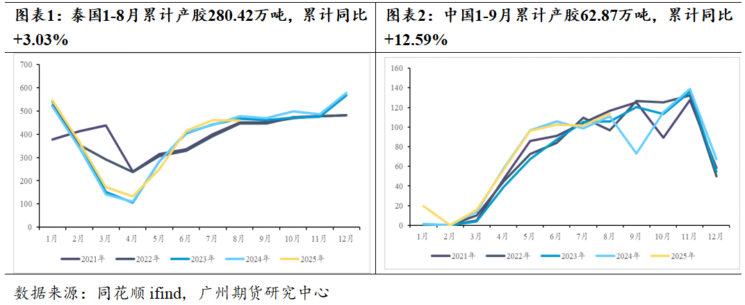 泰国主产区方面,10月上旬,泰国东北部及北部降雨有缓解,割胶工作正常进行,尽管泰国南部地区出现不规律降水干扰,但增量预期拖拽整体原料价格跌幅较大。10月下旬,台风影响南部产区出现强降雨,原料释放不畅。但进入11月后泰国整体降雨量较少,气候恢复正常。