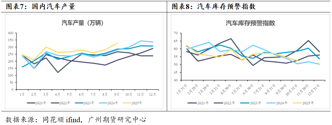 终端汽车市场消费方面,9月中国汽车产量为327.60万辆,环比+16.38%,同比+17.17% 。1-9月国内汽车产量累计为2430.30万台,累计同比+13.24%。今年以来汽车消费表现强劲,汽车以旧换新政策继续显效,部分暂停的地区开始恢复,行业综合治理“内卷”工作取得积极进展,地方车展火热进行,企业新品密集上市。汽车市场整体延续良好态势,产销月度同比增速已连续5个月保持10%以上,且新动能加快释放,对外贸易呈现韧性。但从月度汽车库存预警指数来看,尽管10月为52.50,环比-1.90,但仍然处于荣枯线上方,汽车行业流通速度存疑。