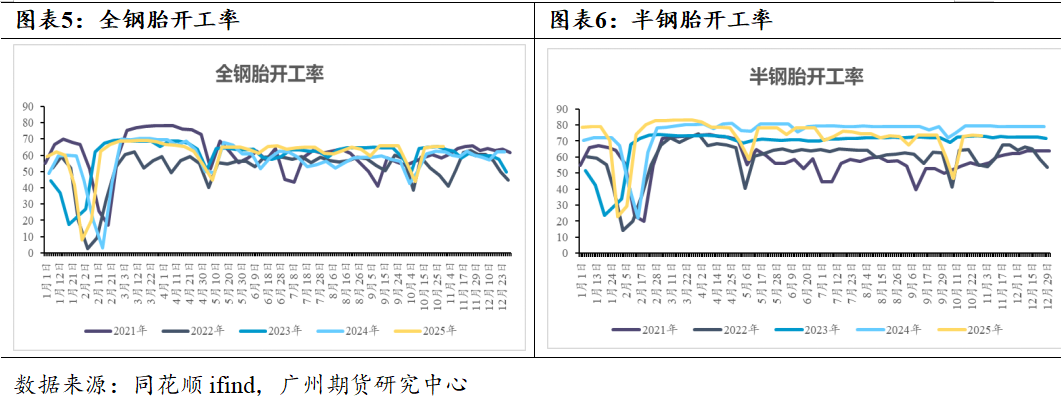 下游需求方面,周度全钢胎样本企业产能利用率为65.34%,环比-0.24%,同比+3.2%。半钢胎样本企业产能利用率为73.41%,环比-0.26%,同比-5.92% 。全钢胎周度库存天数为39.01天,环比-1.33天,同比-0.2天。半钢胎周度库存天数为44.82天,环比-0.44天,同比+8.33天。