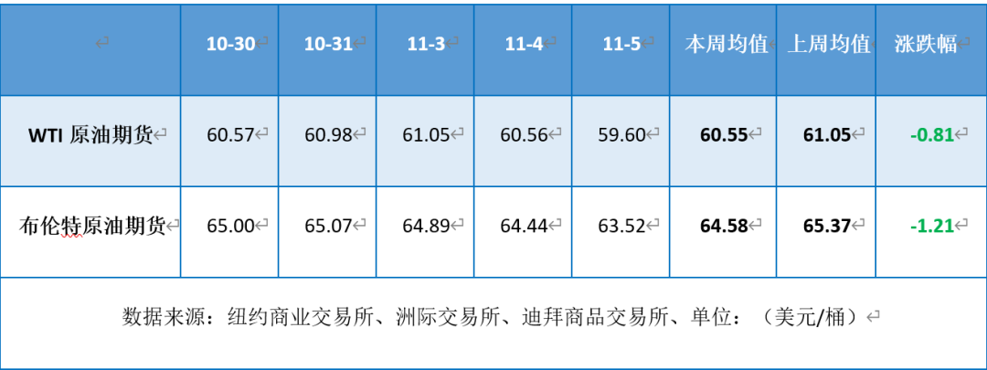 本周(10.30-11.5),原油整体呈现区间震荡的走势,周均价环比下跌。
