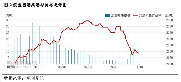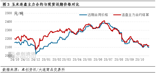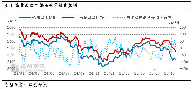 市场情绪方面,新季玉米上市前,由于深加工企业采购积极性较高,加之陈粮可售库存偏低,新作开秤价格普遍高于去年同期,北方港口新季玉米开秤价格高于去年同期70元/吨,市场情绪相对稳定。而进入10月后由于产区温度不适于农户保存,外加单产提升,平均盈利上涨,农户售粮积极,市场有效供应增量明显,而下游企业维持刚需补库,贸易环节也未有过高得入市积极性,市场近月情绪转弱,进一步利空南北港玉米价格。截至10月14日,连盘主力2601合约结算价为2087元/吨,较月初下跌91元/吨。而10月下旬期货盘面回稳,也是北港价格止跌的原因之一。