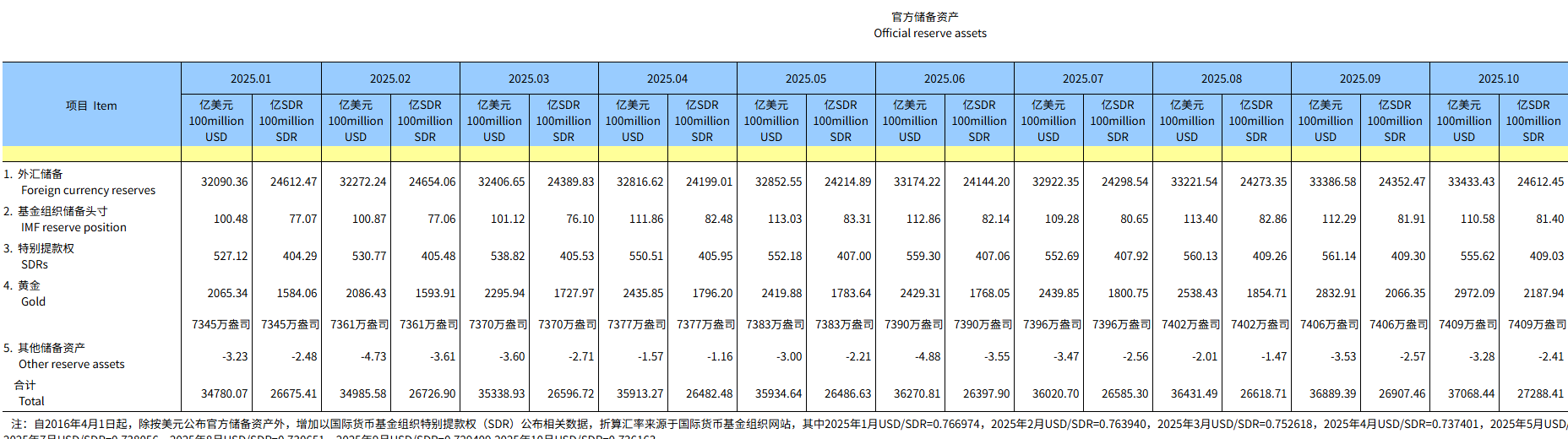 10月末外汇储备3.343万亿美元央行连续第12个月增持黄金
