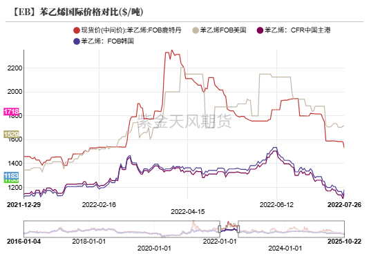 从宏观周期来看,2022年已经步入了加息周期。美联储于2022年3月开始加息,但幅度较小,时间来到5月,美国CPI同比8.6%,6月CPI同比9.1%,创下近41年来新高,通货膨胀形势严峻。因此,美联储于5月开始加息50个基点,并于6月再度加息75个基点以抑制通胀。利率的大幅上升短期内抑制了总需求,并直接导致了原油价格的下跌,促使苯乙烯的第二个拐点的到来。