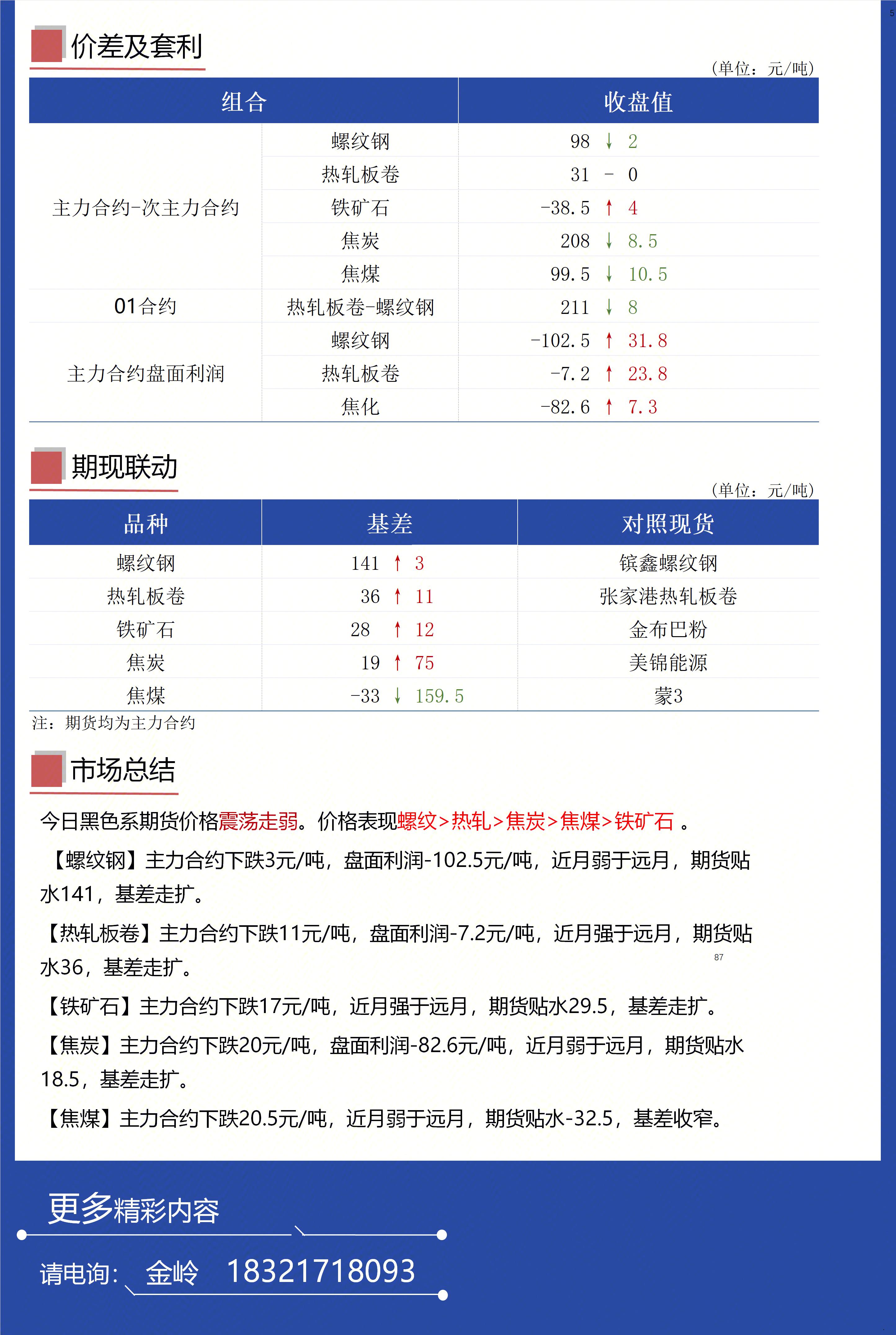 今日黑色系期货价格震荡走弱。价格表现螺纹>热轧>焦炭>焦煤>铁矿石 。 【螺纹钢】主力合约下跌3元/吨,盘面利润-102.5元/吨,近月弱于远月,期货贴水141,基差走扩。【热轧板卷】主力合约下跌11元/吨,盘面利润-7.2元/吨,近月强于远月,期货贴水36,基差走扩。【铁矿石】主力合约下跌17元/吨,近月强于远月,期货贴水29.5,基差走扩。【焦炭】主力合约下跌20元/吨,盘面利润-82.6元/吨,近月弱于远月,期货贴水18.5,基差走扩。【焦煤】主力合约下跌20.5元/吨,近月弱于远月,期货贴水-32.5,基差收窄。