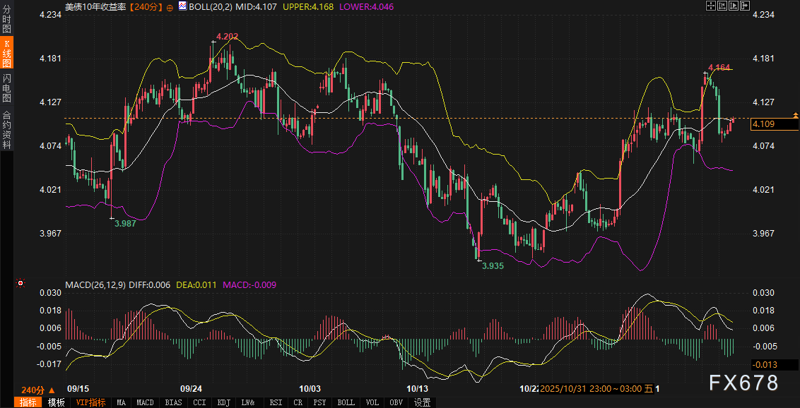 反观10年期美债收益率的240分钟图,报价4.109已触及布林带中轨4.107,涨幅0.51%推动其逼近上轨4.168,下轨4.046提供初步支撑。MACD的DIFF 0.006与DEA 0.011同样为正值,但DIFF的微弱上行显示多头动能初现,尚未形成强势背离。这与威廉姆斯的储备评估相呼应:回购压力的缓解,可能让收益率在中轨附近横盘,消化供给端的短期冲击。技术派交易者在讨论瑞·达利欧的泡沫警示时指出,央行购债将创造流动性,压低实际利率,从而放大资产价格的相对回报偏差。这类观察与指标共振:若收益率上轨失守,美债将面临进一步上行压力,美元指数则可能借势测试下轨支撑。