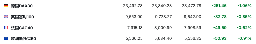2. 截至发稿,德国DAX指数跌1.06%,英国富时100指数跌0.85%,法国CAC40指数跌0.62%,欧洲斯托克50指数跌0.91%。