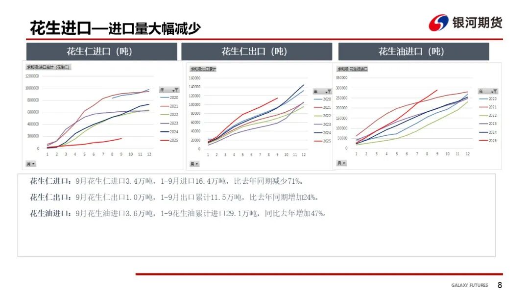 国内花生市场平稳运行。近两日天气转晴,筛选厂陆续筛选花生,部分产区走货略有好转。新花生水分仍然偏高,市场收购谨慎,以质论价为主。销区市场陆续消化陈花生,两广油坊多以压榨新季花生为主。主力油厂到货量有限,鲁花工厂基本无到货,处于全面停机状态,部分工厂成交价格在8600-9000元/吨;部分油厂少量收购进口花生以及冷库货源。