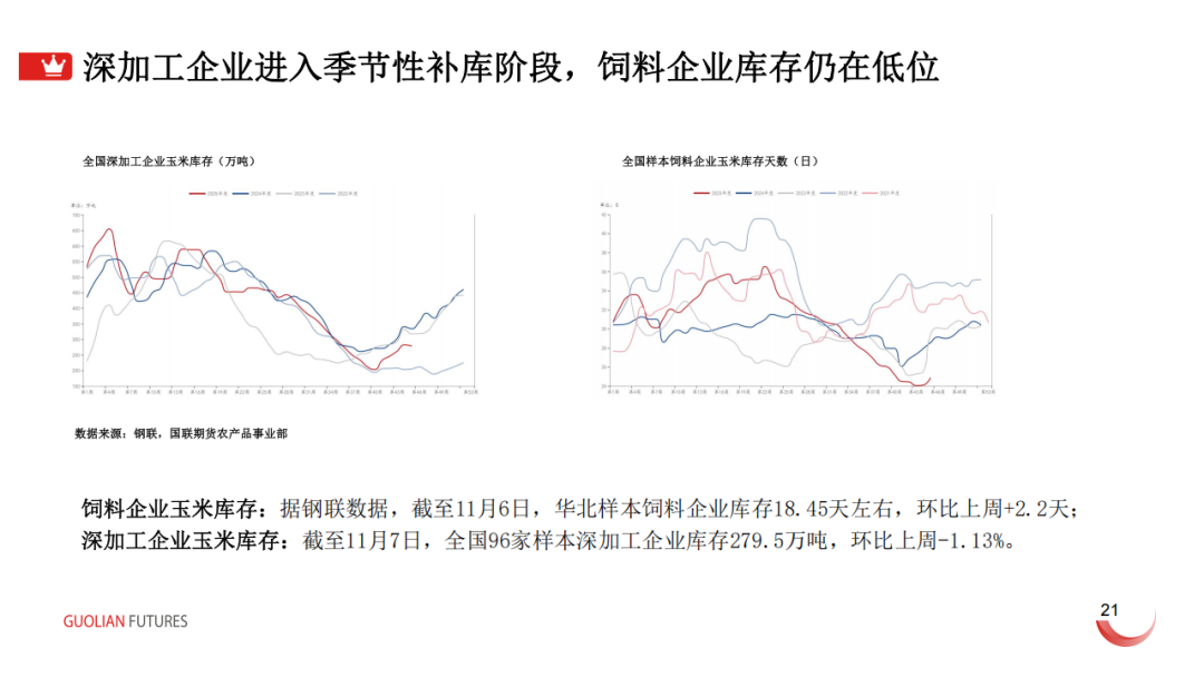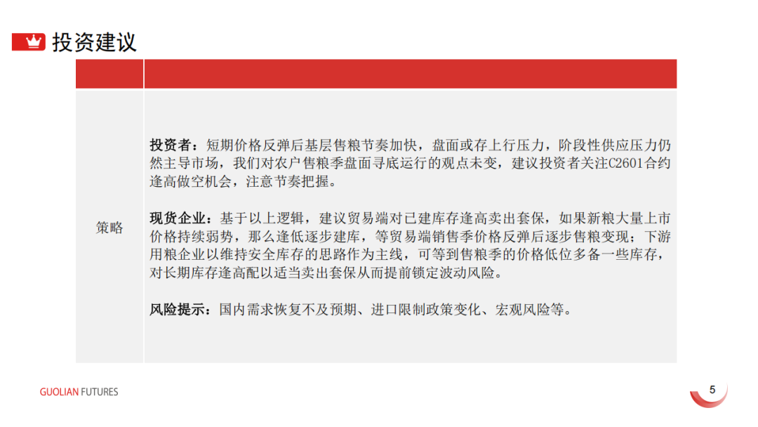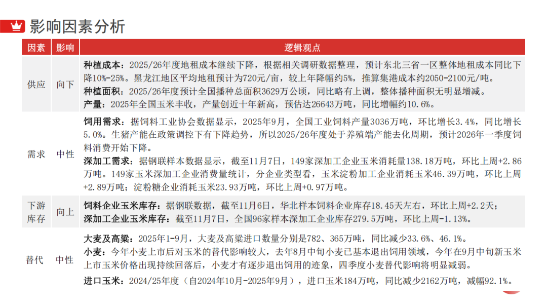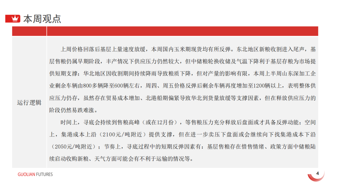 逻辑分析:对于玉米而言,现货方面表现为上中下游之间的博弈,上游农户余粮较多,售粮压力较大,而中下游贸易商和饲料企业出于对进口政策和年后需求的担忧,补库意愿较弱,深加工企业多已经历补库过程,年前现货弱势或将延续。期价方面,远月新合约上市后维持升水格局,或表明市场对供需依旧乐观,考虑到抛储底价上调预期,期价继续下跌...