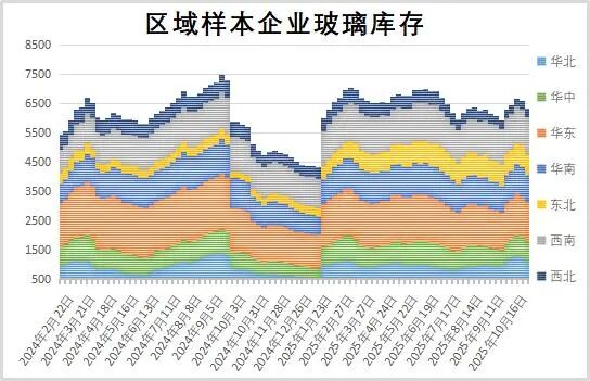 财联社鹰眼讯,据隆众资讯,截止到11月6日,全国浮法玻璃样本企业总库存6313.6万重箱,环比下降265.4万重箱或4.03%,同比增幅继续升至29.05%,折库存天数27.1天,较上期下降0.9天。本周沙河地区在集中停线消息发酵下,业者提货积极性高涨,下游多刚需采购补货,厂家产销率普遍较高,华北区域库存环比大幅下降10.83%。华中地区中下游刚需拿货叠加小部分业者转库操作,整体产销较好,库存下降5.81%。沙河停线消息笼罩,情绪上对企业出货有所影响,叠加个别加工厂前期库存消耗,周内拿货积极性有所提高,华东地区多数企业库存呈现阶段性的下滑。华南玻璃产销表现平淡,部分通过降价或凑量优惠政策刺激出货;东北地区年底需求叠加部分货源外发,整体库存亦环比下降近3%;西北区域部分低产及冷修品牌持续消化库存,带动本地库存小幅下降。另外,仅西南区域库存环比小增,平库与累库情况并存。